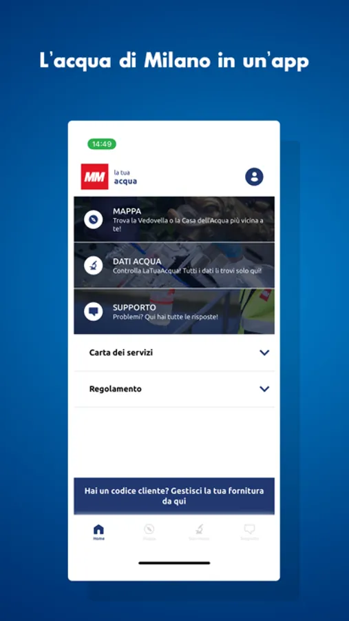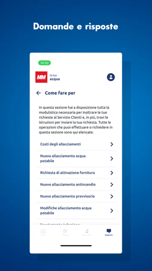• SUPPORTO: per sapere come inviare le tue richieste al Servizio Clienti, trovare le risposte alle domande più frequenti sul servizio e i canali di contatto con MM Spa, il gestore del Servizio Idrico Integrato di Milano (Pronto Intervento e Servizio Clienti)