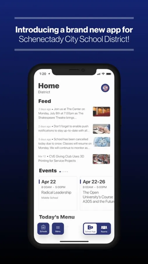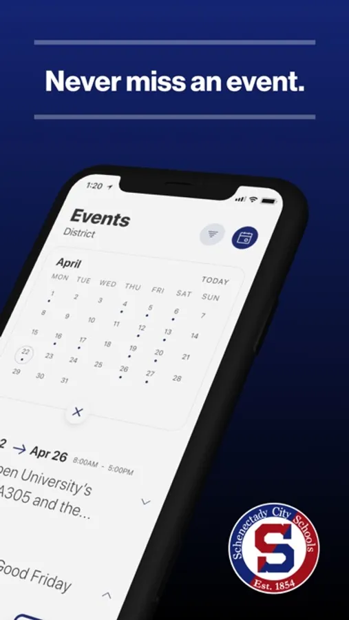 The event section shows a list of events throughout the district. Users can add an event to their calendar to share the event with friends and family with one tap.
