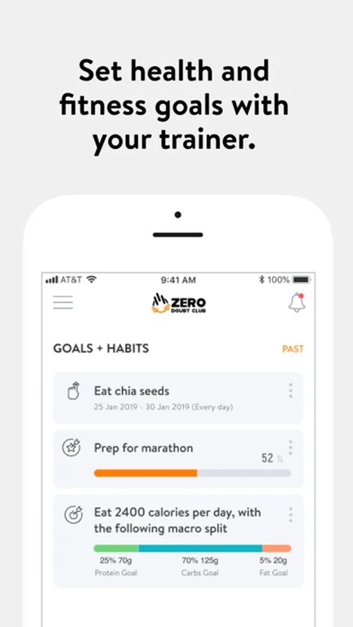 With the Zero Doubt Club App, you can start tracking your workouts and meals, measuring results, and achieving your fitness goals, all with the help of your personal trainer.