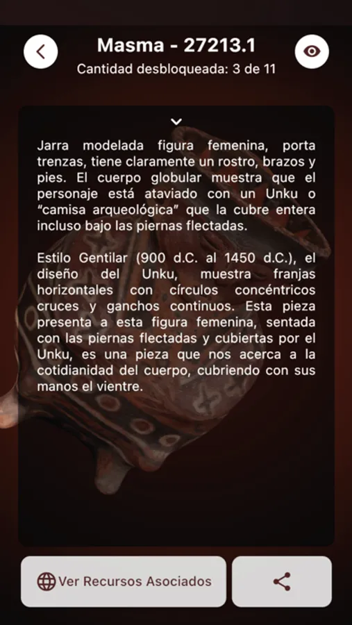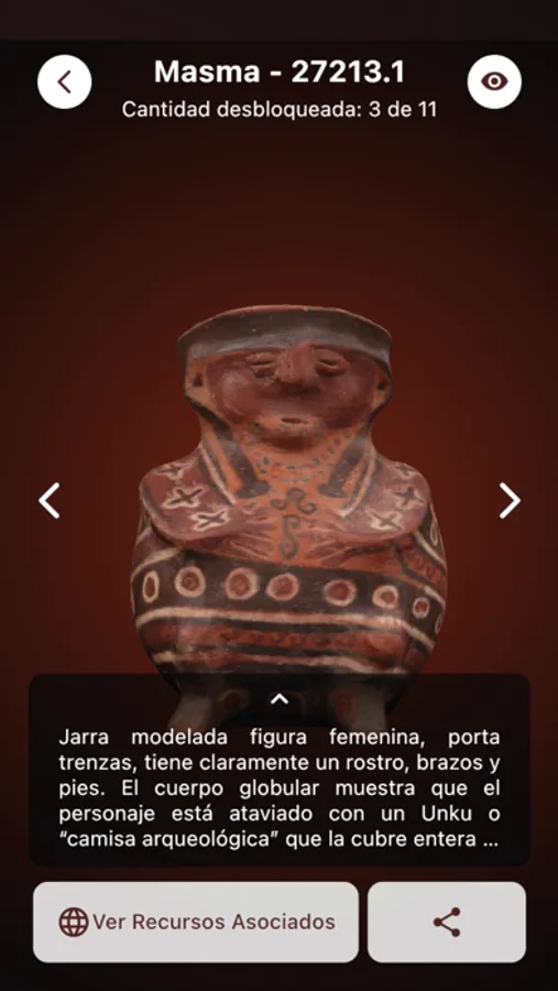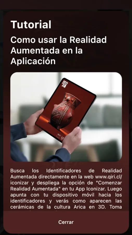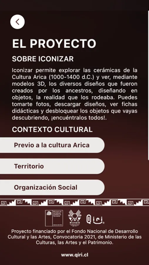 Iconizar permite explorar las cerámicas de la Cultura Arica (1000-1400 d.C.) y ver, mediante modelos 3D, los diversos diseños que fueron creados por los ancestros, diseñando en objetos, la realidad que los rodeaba. Puedes tomarte fotos, descargar diseños, ver fichas didácticas y desbloquear los objetos que vayas descubriendo, ¡encuéntralos todos!.