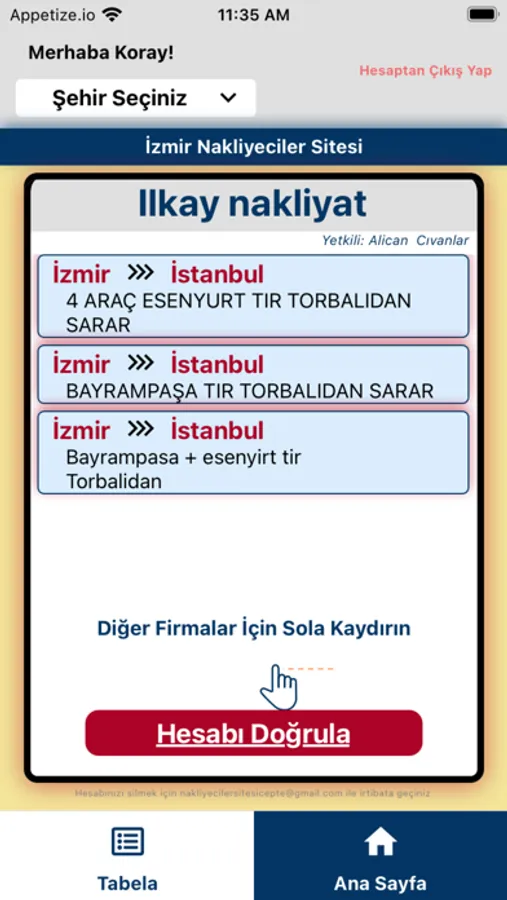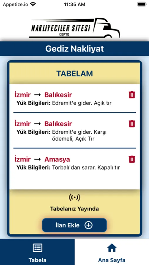 Nakliyecinin, yük ilanlarını paylaştığı tabelalarını sanal ortama aktararak taşıyıcılara sunmasını sağlayan uygulamadır. Diğer birçok uygulamadan farklı olarak Nakliyeci, yük ilanlarını tabelasında paylaştığı gibi , Nakliyeciler Sitesi Cepte uygulamasında da aynı şekilde tabela oluşturarak taşıyıcılara sunacak. Taşıyıcılar da kendileri için uygun yükleri pratik bir şekilde bulabilecek!