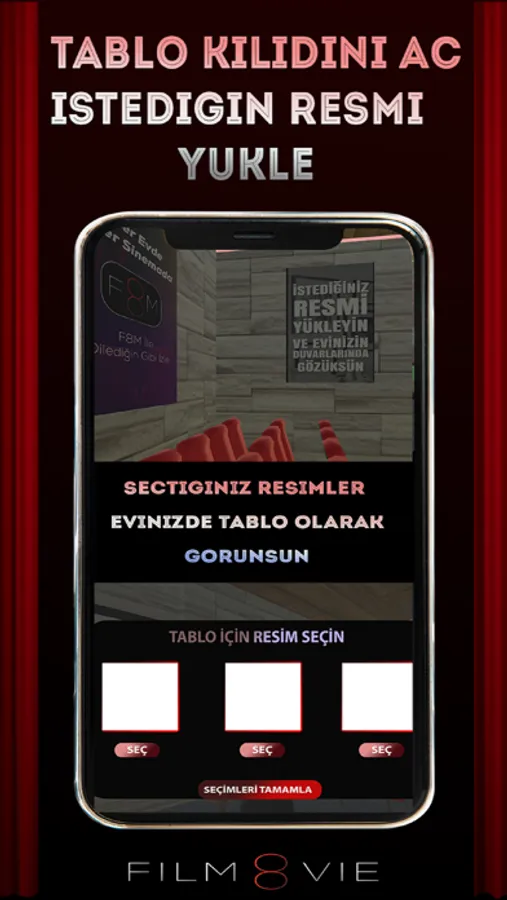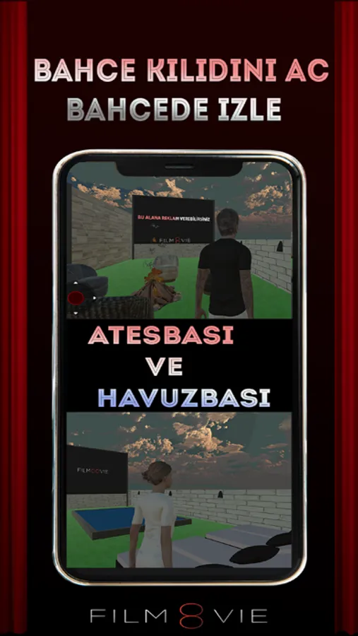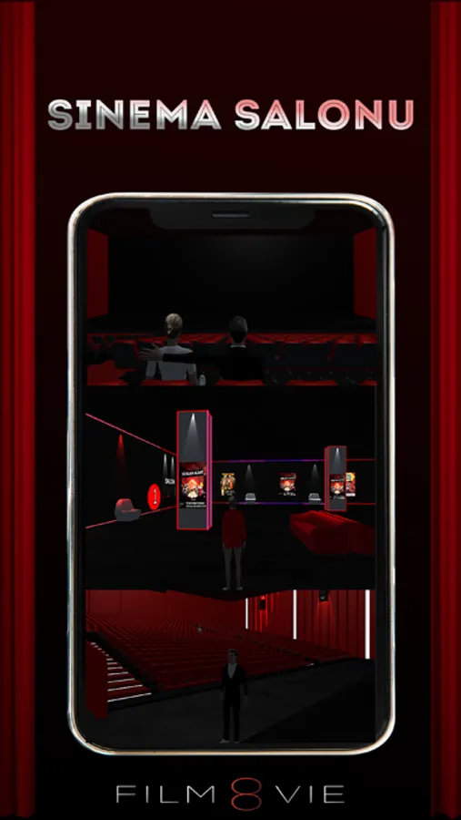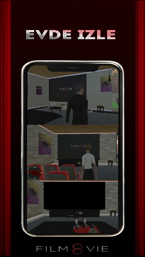 Uygulamamız içerisinde 3d olarak oluşturulmuş olan sanal gerçeklik hissiyatı veren sinema salonu bulunmaktadır. Koltuğunuza oturabilir ve sinema salonu hissiyatı ile izleyebilirsiniz.