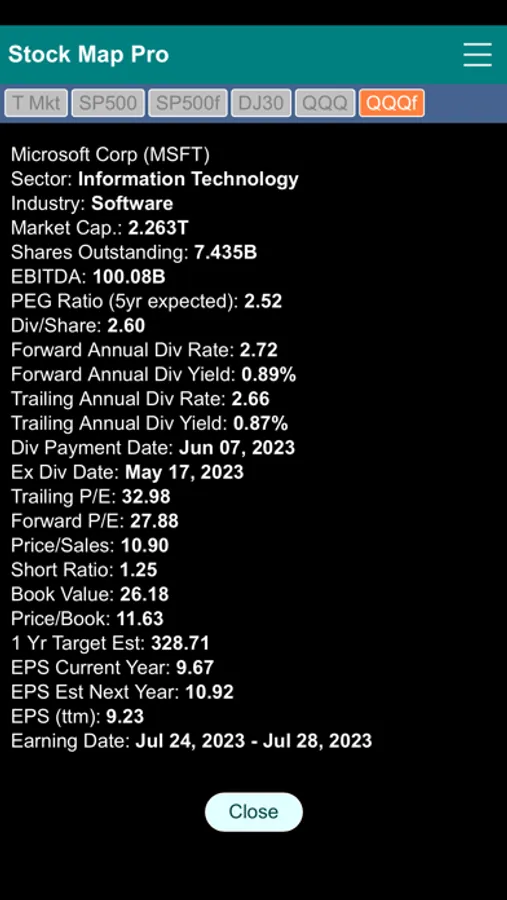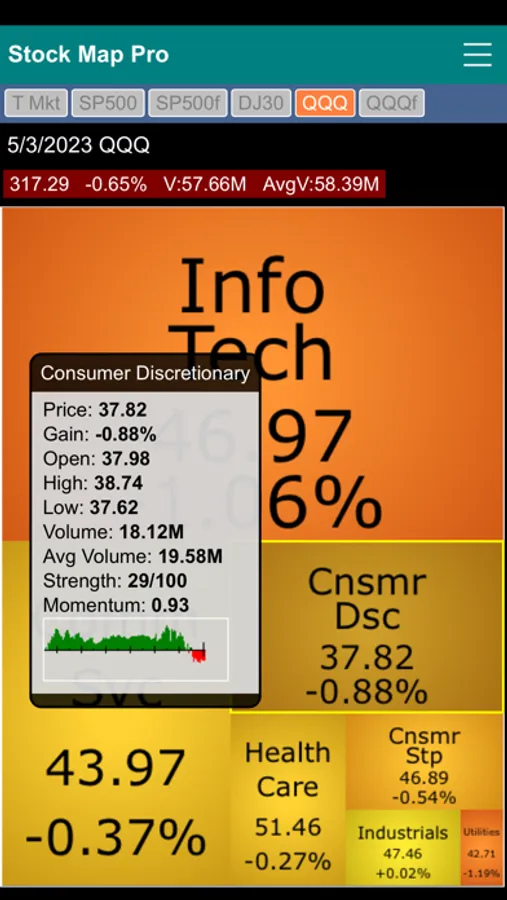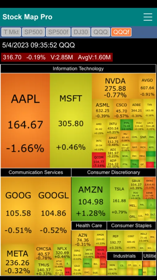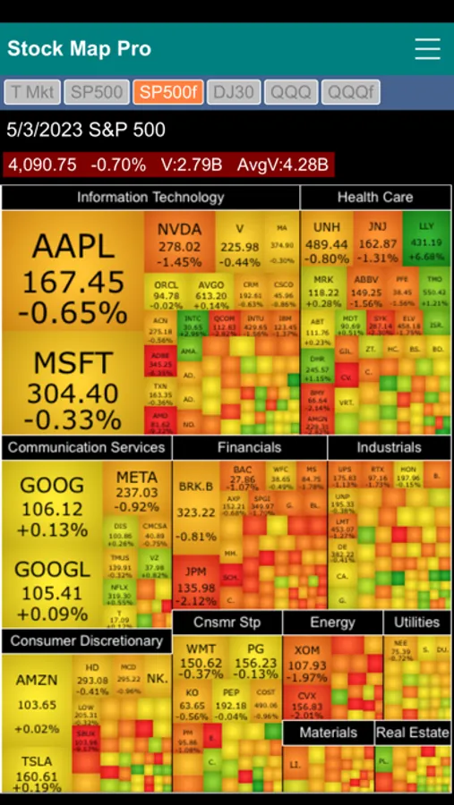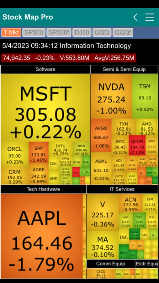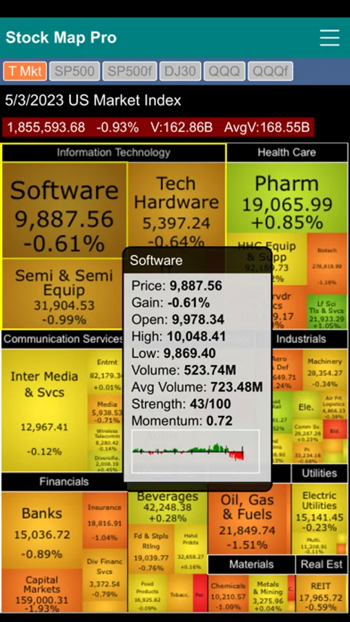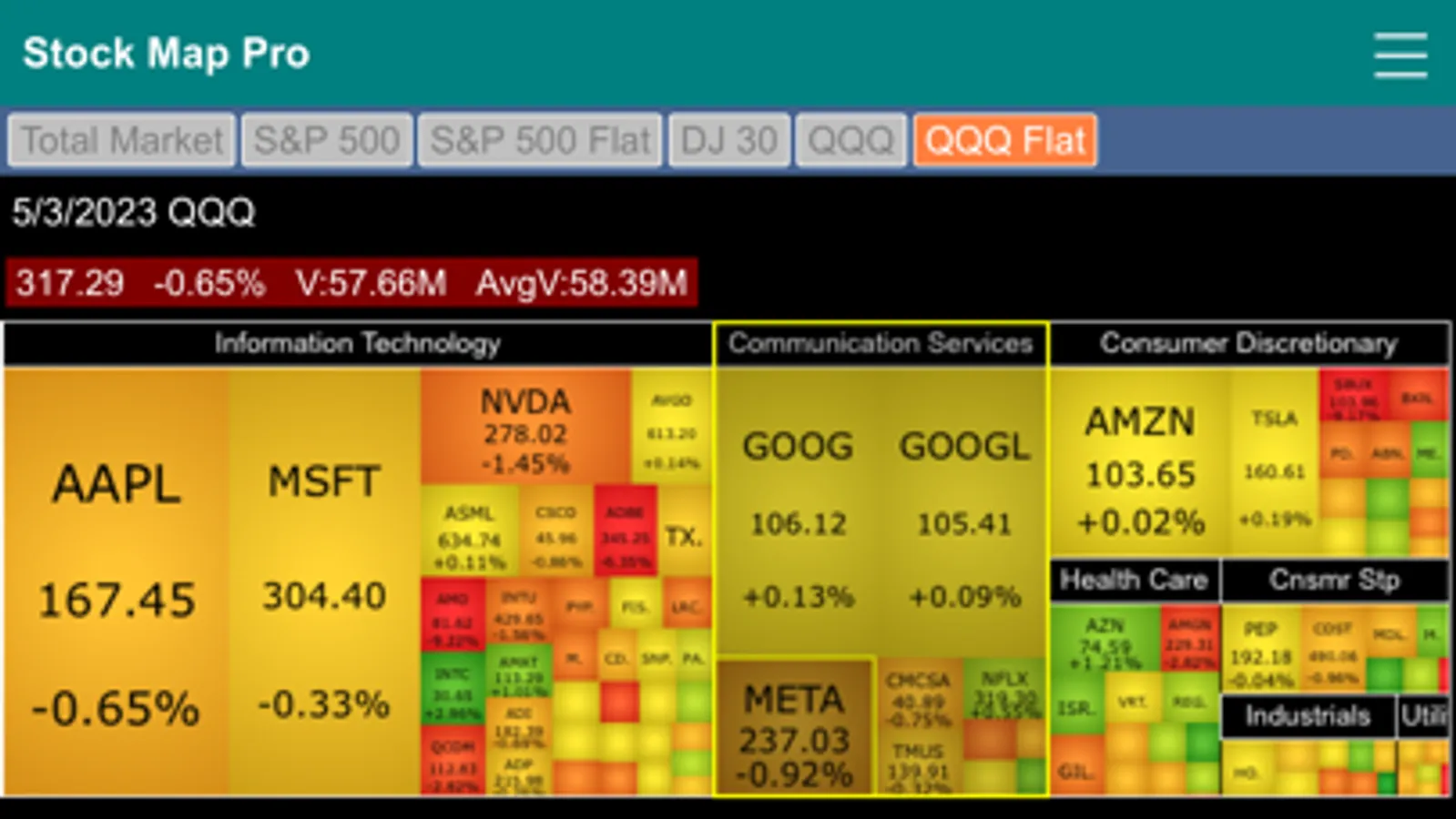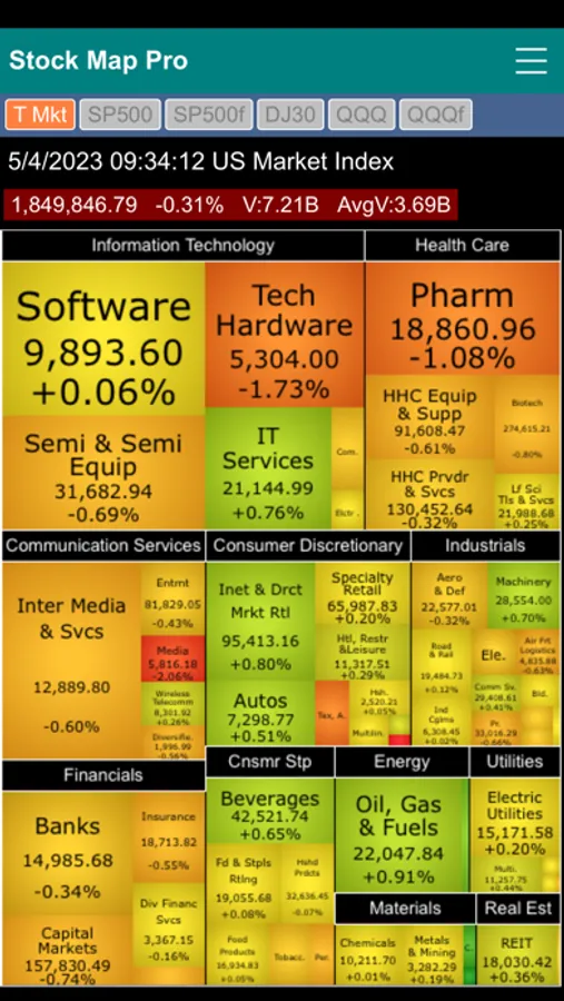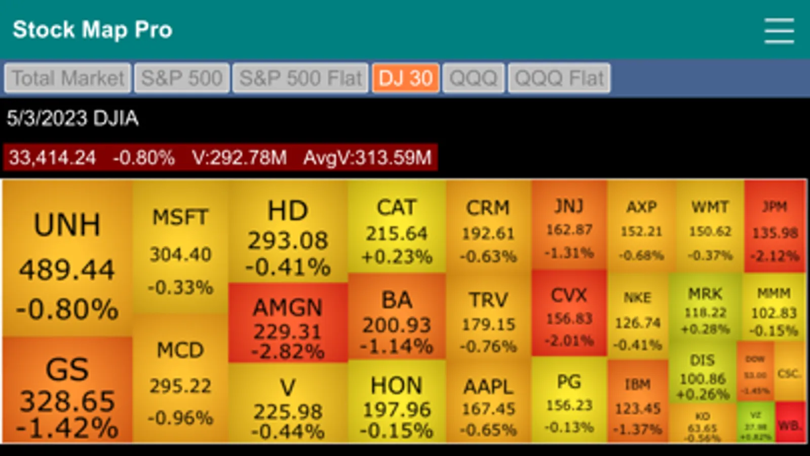 Stock Market Map Professional Edition (Stock Map Pro) contains six stock market heat maps in one app. It features the Total Market map, S&P 500 two-level map, S&P 500 flat map, Dow Jones 30 Industrial map, QQQ two-level map and QQQ flat map.