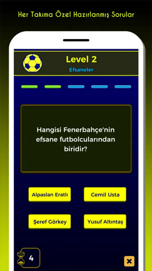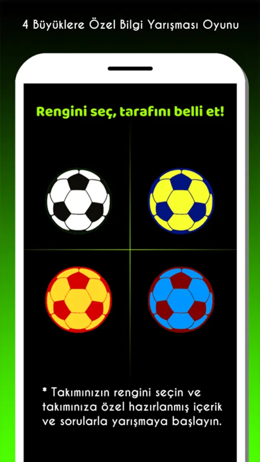 4 büyük takım taraftarı için yeni bir heyecan başlıyor... 4 Büyükler Bilgi Yarışması Oyunu! Kara Kartallara, Fenerlilere, Cimbomlulara ve Karadeniz Fırtınalarına özel hazırlanmış 4 bilgi yarışması tek oyunda. Üstelik ister kendi takımın ister rakip takım taraftarları ile karşılıklı düellolar, zorlu leverler, günlük yarışlar ve daha bir çok sürpriz içerik ile dopdolu bir bilgi yarışması oyunu.