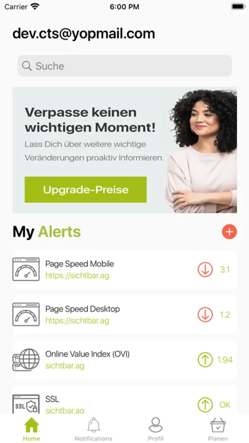 Pro aktives monitoring Ihrer wichtigsten Online Marketing Key Performance Indikatoren! Der Aufwand von ständigem Überwachen eines Wertes, wie dem Domain Score, Website Performance oder das monatliche Suchvolumen Ihres Branding-Keywords entfällt. Lassen Sie sich einfach pro aktiv informieren und monitoren Sie somit Ihre wichtigsten Kennzahlen automatisiert.