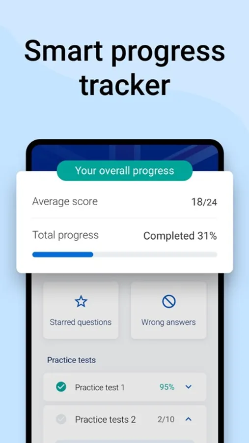 There is overall progress on the main screen of the application. Thus, you can instantly follow how prepared you are for the exam.