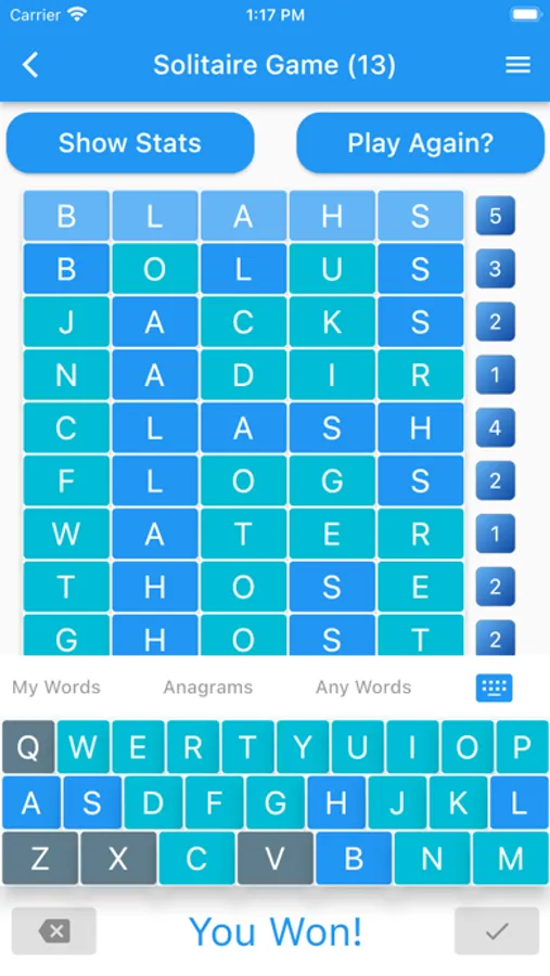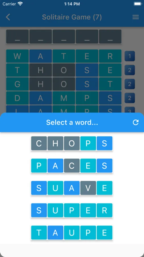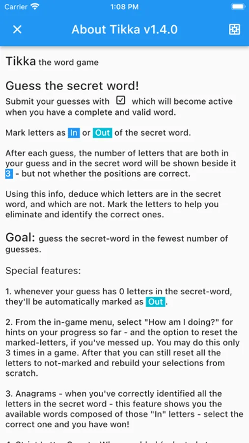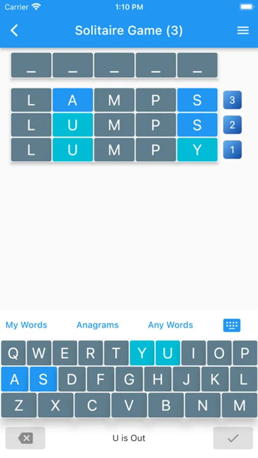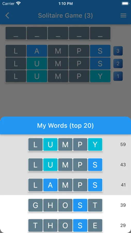 Guess the secret word. Play Daily Word to compete with your friends, or a quiet Sollitaire game. Play word-lengths from 4, up to 9 letters! Based on the old Jotto game - with extras such as Anagram-generator and "How am I doing?" features.