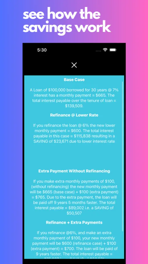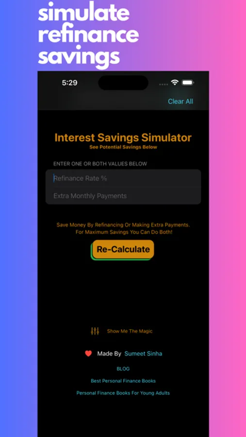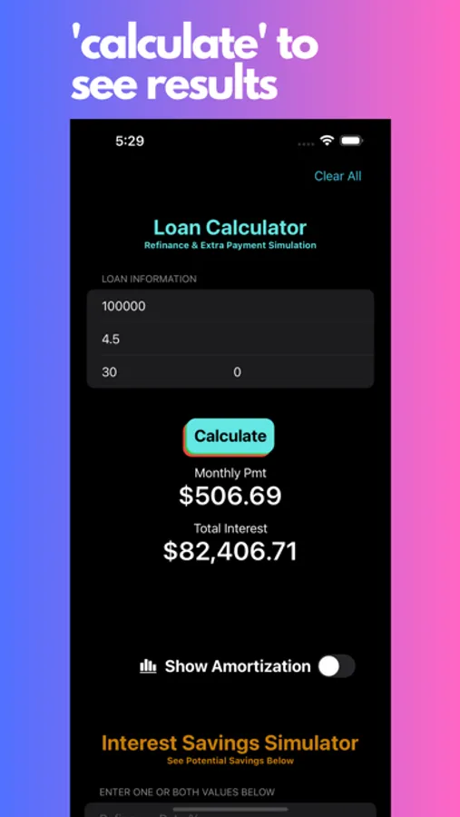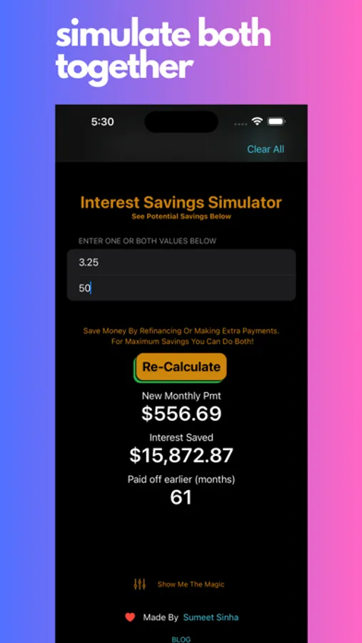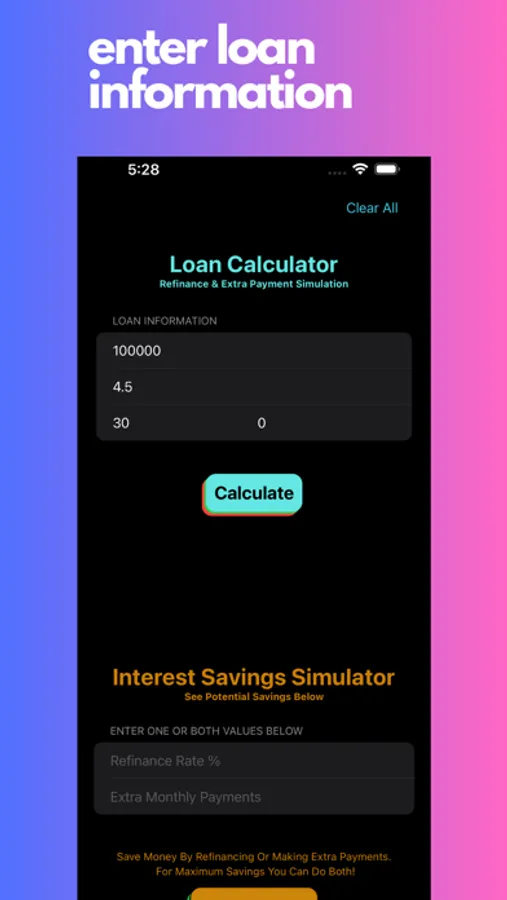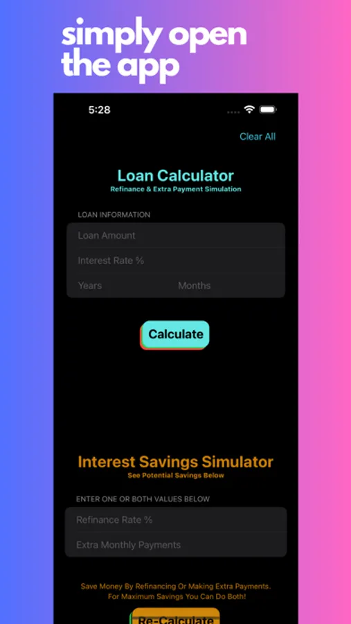 Loan Calculator & Simulator App is a powerful financial tool that simplifies the complex process of managing loans, refinancing options, and extra payments, right at your fingertips. Whether you're looking to purchase a new home, refinance an existing loan, or accelerate your debt repayment, this app provides you with accurate calculations and valuable insights to make informed financial decisions.