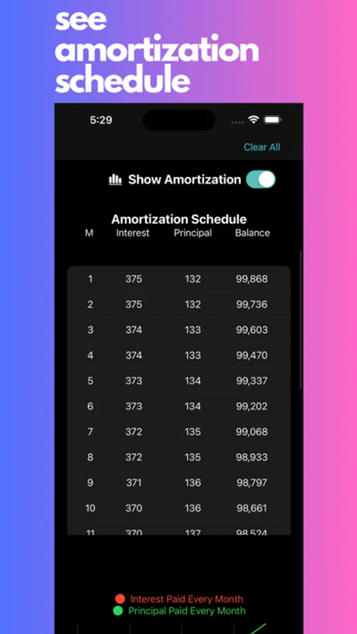- View amortization charts for principal paid, interest paid, and reducing loan balance every month