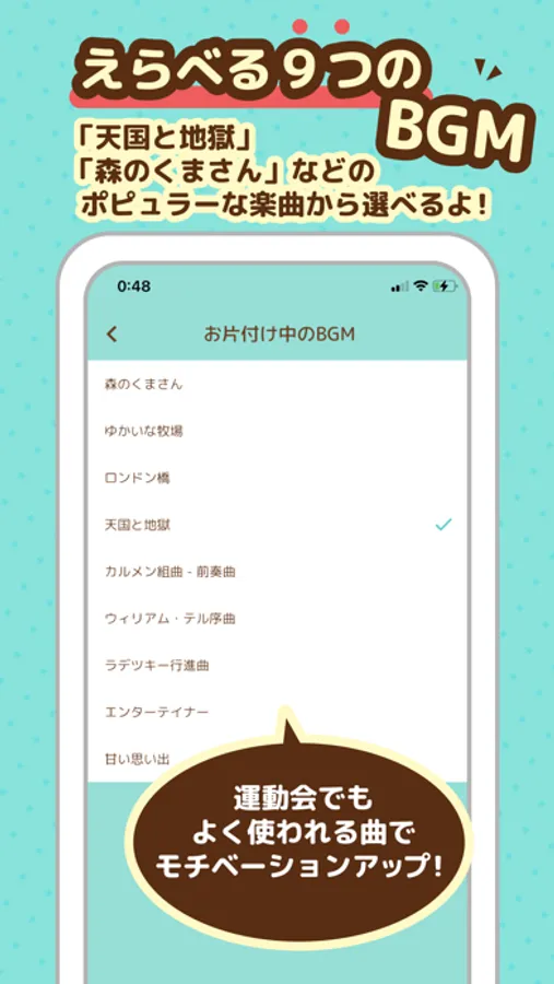 「天国と地獄」「森のくまさん」など、馴染みのある楽曲をBGMにしてタイマーが動きます。
