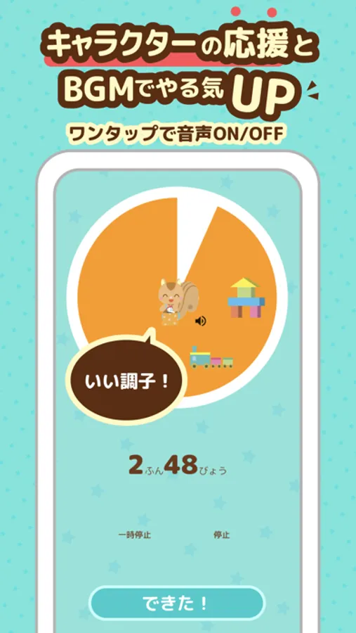 30秒ごとに「いい調子!」「あと少し!」など、かわいいボイスでキャラクターが応援してくれます。