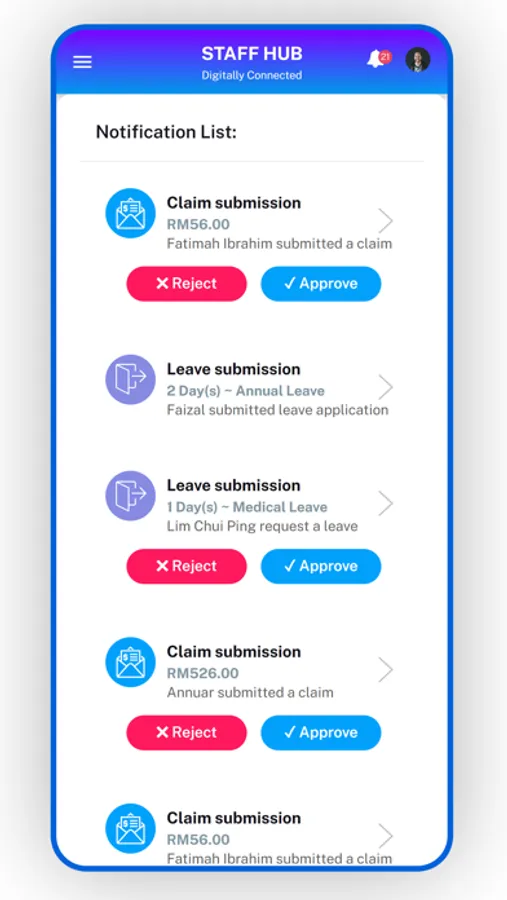 FortuneBit StaffHub is a Mobile App that interacts with the ERPNext solution provided by Tektician Sdn Bhd for the purpose of allowing employees and HOD to interact with the Human Resources module of the enterprise solution.