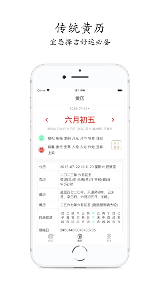 支持星座、干支、生肖、节气、节日、彭祖百忌、每日宜忌、吉神宜趋、凶煞宜忌、吉神方位、冲煞、纳音、星宿、八字、五行、十神、建除十二值星、青龙名堂等十二神、黄道日及吉凶查询。