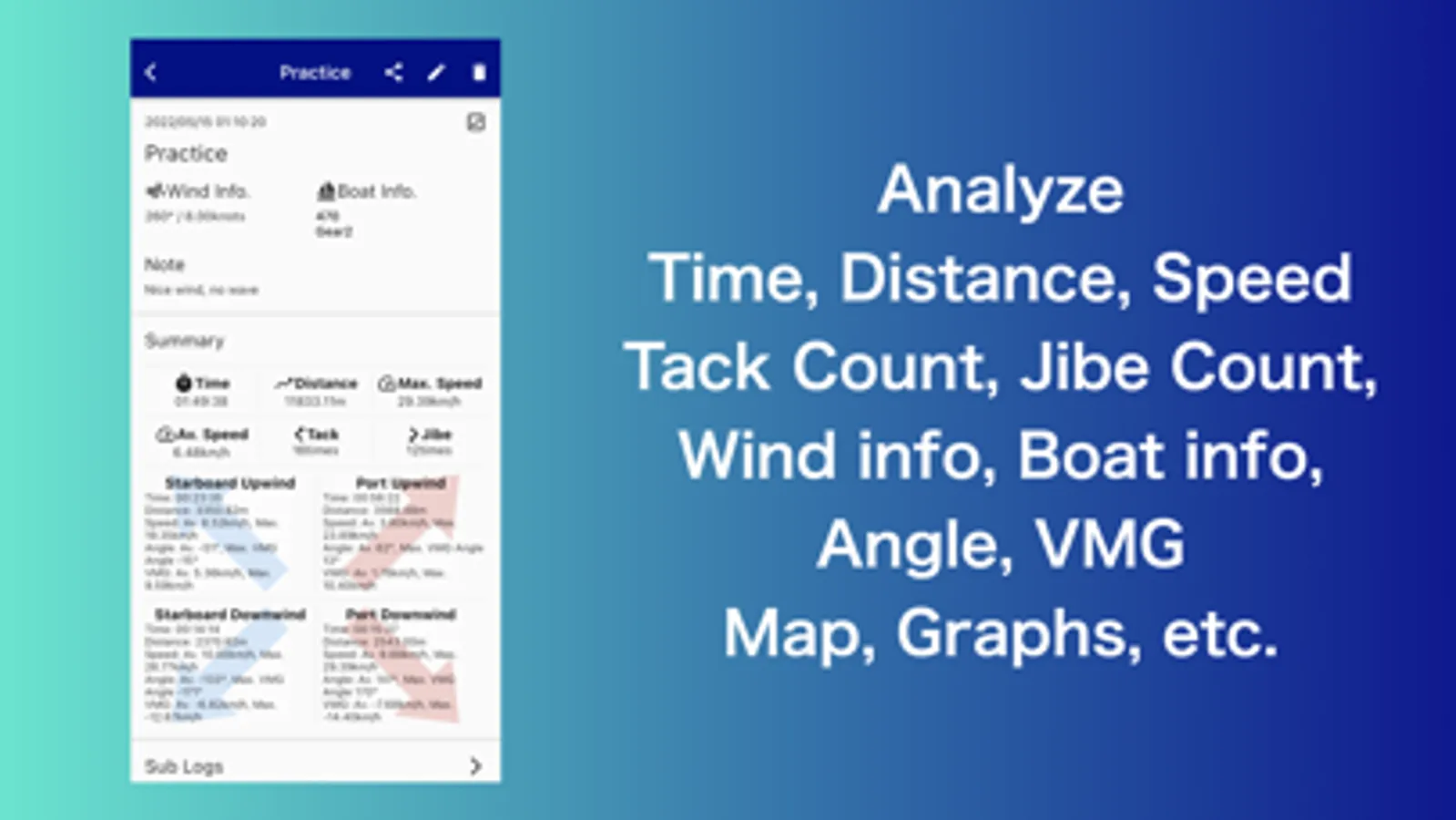- Analysis function (time, distance, speed, number of tacks, number of jibes, sailing angle against the wind, calculation of VMG)