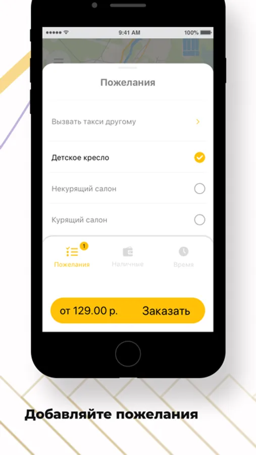 Добавьте к заказу дополнительные пожелания. Например, когда едете с ребенком — выберите "детское кресло". Если вы не переносите запах табака — укажите "Некурящий салон", и к вам приедет некурящий водитель.