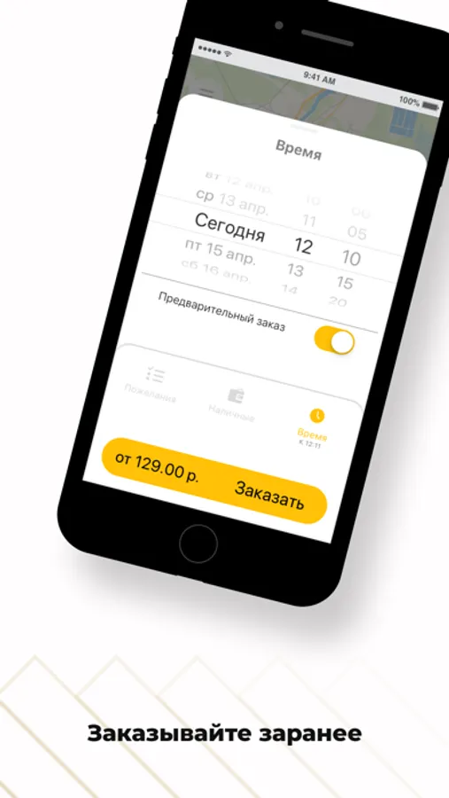 Выберите опцию “Предварительный заказ”. Поиск автомобиля начнется незадолго до заказа поездки, и автомобиль приедет к назначенному времени. Также вы будете заранее знать стоимость поездки.