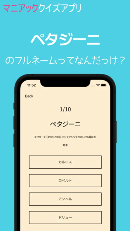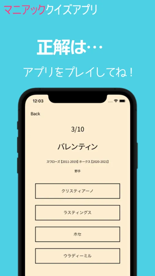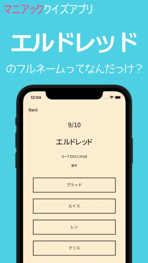 このアプリは、助っ人外国人選手の登録名に対して、4択で回答していくクイズアプリです。