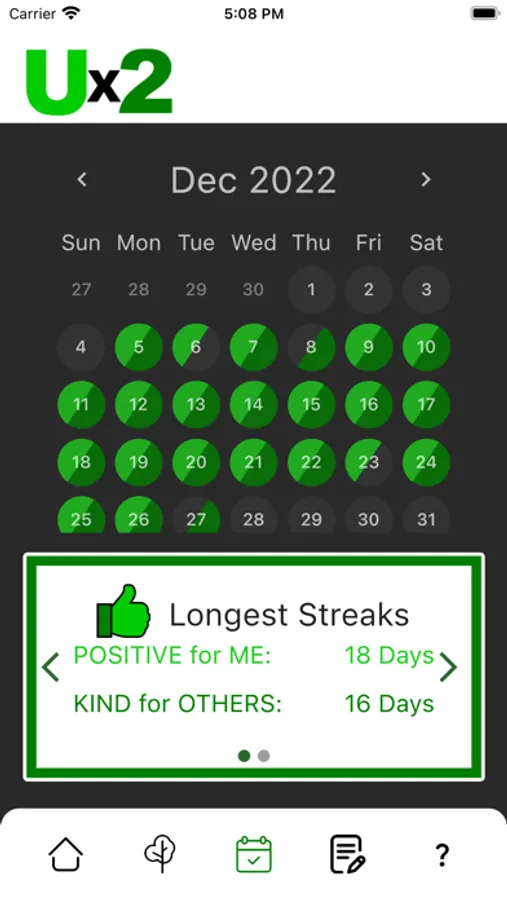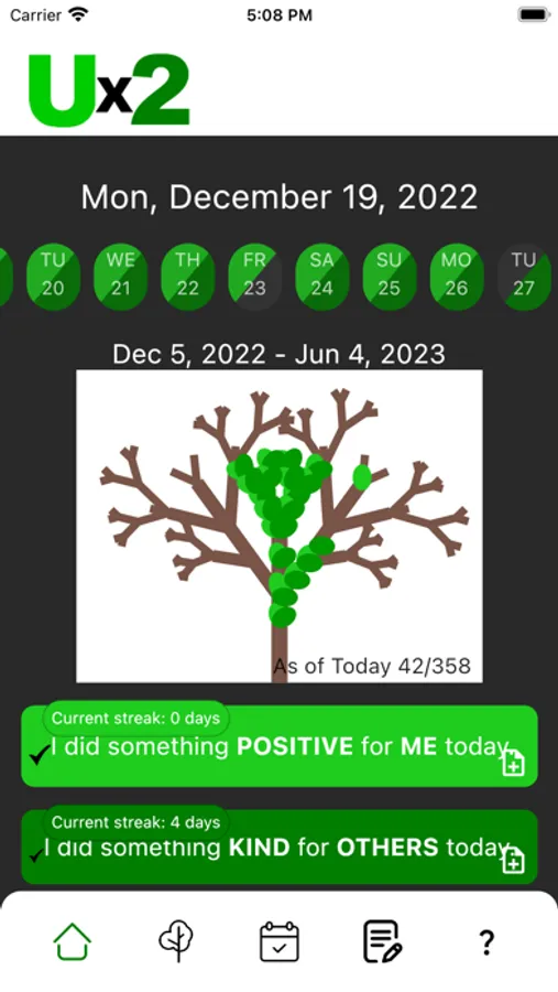 When performed, you will click on the acts performed for the day. With each click you will graphically see your accomplishments - a leaf will be added to your tree. As your tree fills with leaves, you will “grow” as your tree grows -