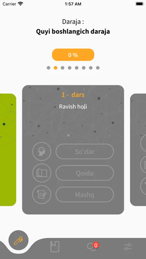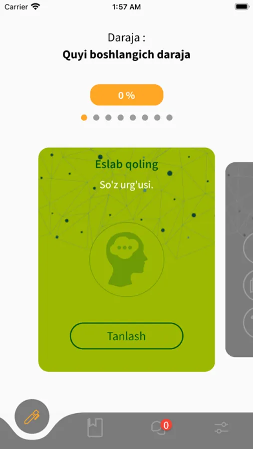 Mashg’ulotning birinchi qismida bir nechta yangi so'zlar bilan tanishasiz. Har bir so'z o'ziga xos jamlanmaga ega. Unga so'zni ifodalovchi rasm, assosiativ matn va so'zning to'g’ri talaffuzi kiradi. So'zlarni eslab qolish alohida takrorlashlar asnosida qurilgan bo'lib ular ma’lum bir oraliqda siz so'zni qanday yod olganingizni tekshirib boradi.