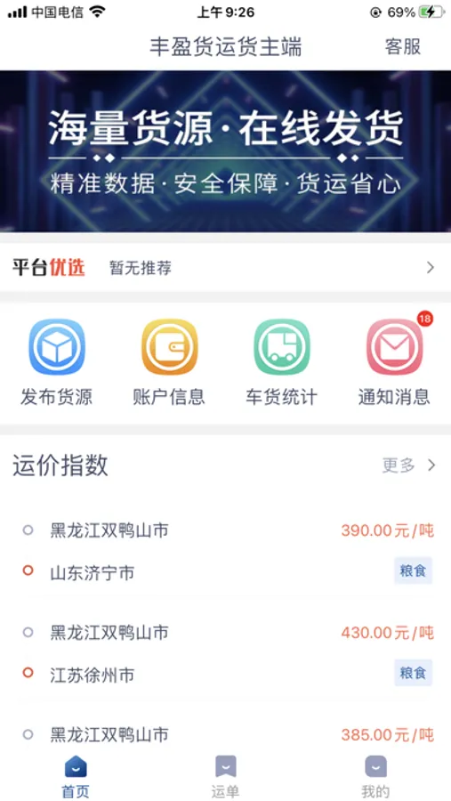 丰盈货运平台是一款专业的物流服务软件,为货主和司机提供在线发布货源、接单匹配、在线交易等功能
