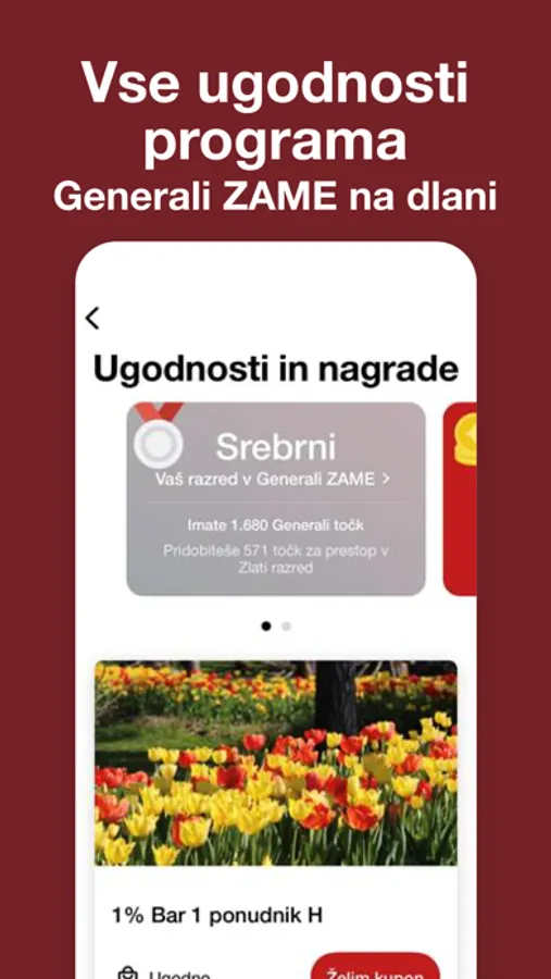 V aplikaciji vam bo na voljo tudi podatek o številu točk, ki ste jih zbrali v Programu prednosti Zame, in nivo, v katerega se uvrščate. V razdelku Ugodnosti in nagrade so vam na voljo vse ugodnosti, do katerih ste upravičeni kot član Programa prednosti Zame in občasne nagrade, s katerimi vas bomo nagradili za doseganje zastavljenih ciljev v mobilni aplikaciji. Koriščenje ugodnosti je povsem enostavno – izberite ponudbo, naročite kupon in pošljemo vam ga po elektronski pošti oz. v vašo mobilno denarnico. Kupon le pokažete izbranemu ponudniku in uživajte v zasluženih ugodnostih in nagradah!