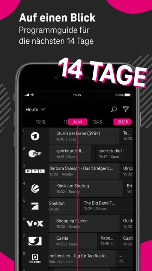 • Unser elektronischer Programm Guide (EPG) zeigt dir, welche Sendungen gerade live im TV zu sehen sind oder in den nächsten 14 Tagen anlaufen werden.
