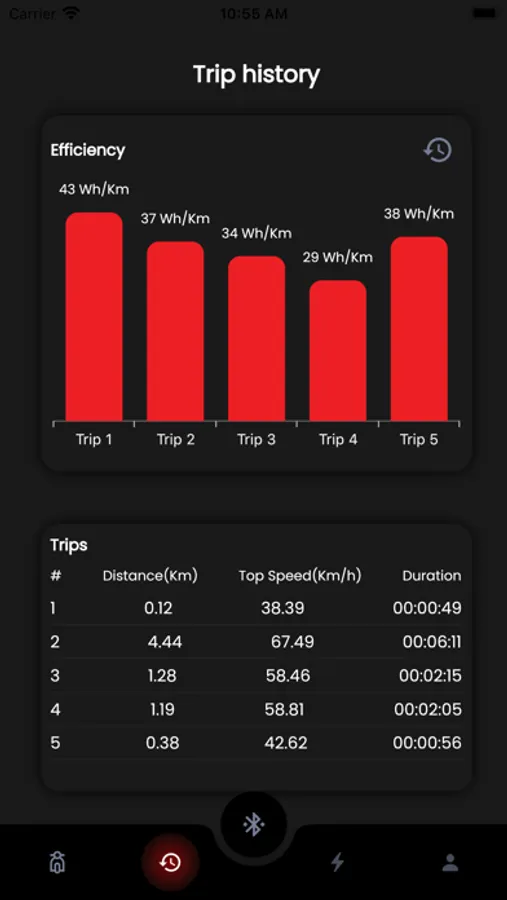 Track your top speed, distance travelled and ride duration of your last few trips.