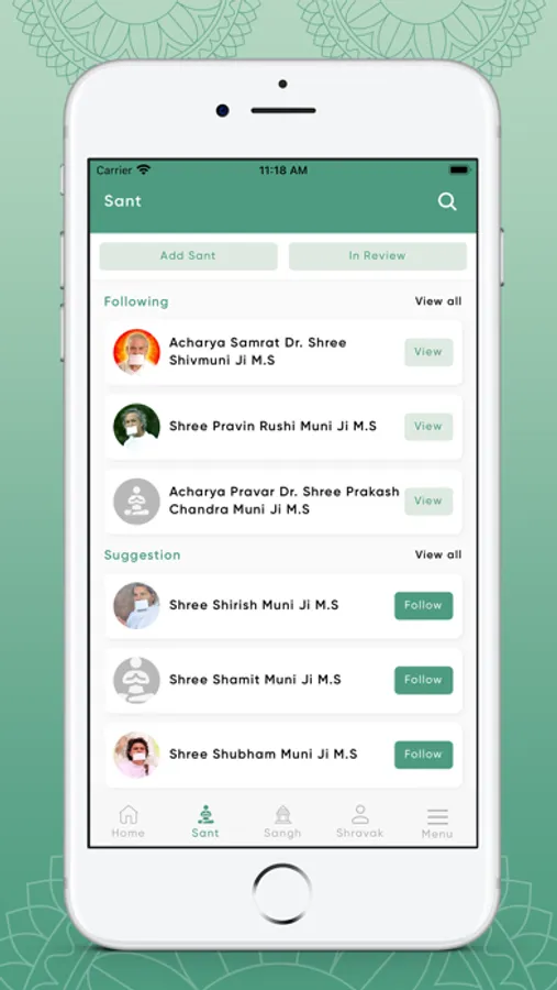 Sant's : Platform provides basic profile of Sant's including Dharm, Sampraday, Gachadhipati, Parents name. In addition, Shravak's will know current location, Thana's , Chaturmas and Vihaar details. Platform has build in workflow to control any changes to Sant's profiles, this is to ensure the authenticity of Sant's profiles.