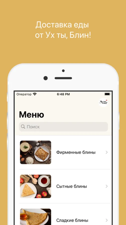 Как сделать заказ в приложении “Ух ты, Блин!”: выберите понравившиеся позиции из меню, добавьте их в корзину и перейдите на экран оформления заказа (по нажатию на иконку корзины).