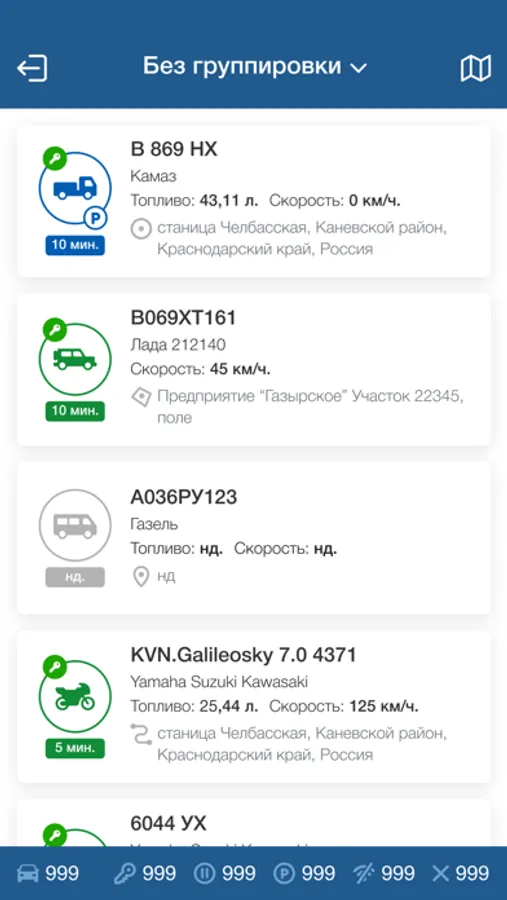 Работа с объектами: Отслеживайте параметры движения, зажигания и местонахождения объектов, а также актуальность полученных данных;