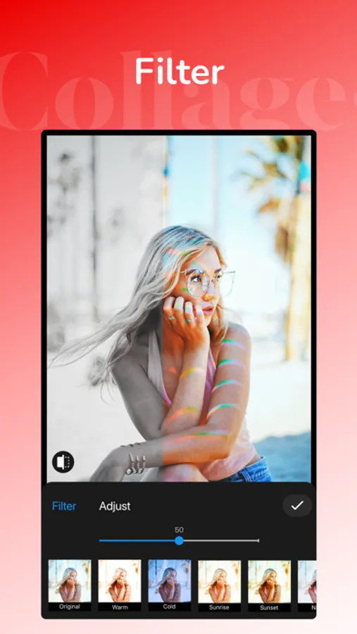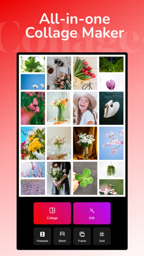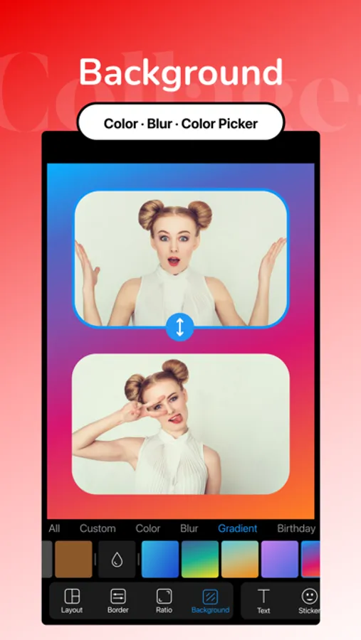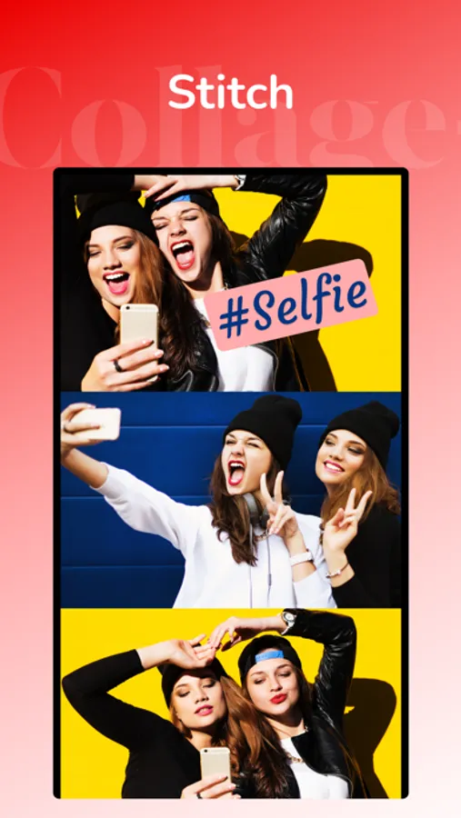 Make photo collage with layouts, border, ratio and background. Edit photo with Filter, Text, Sticker, Watermark, Photo on Photo and much more photo editing tools.
