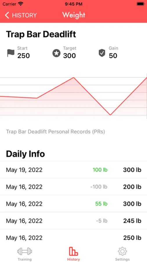 √ The chart tracks your weight lifting trends