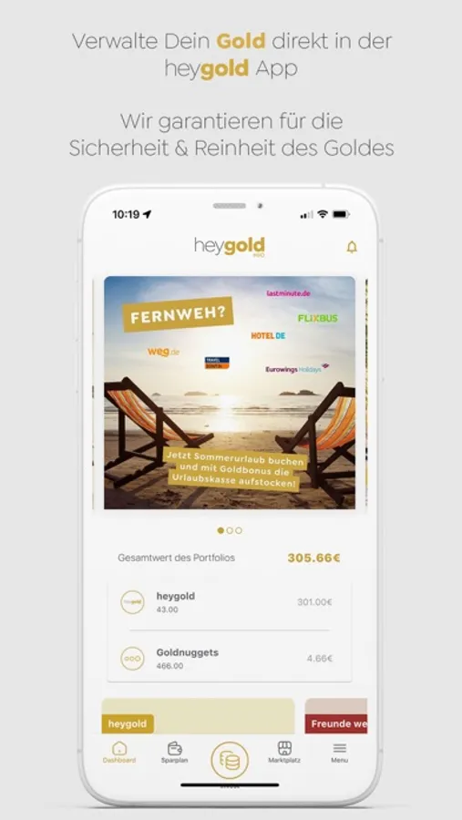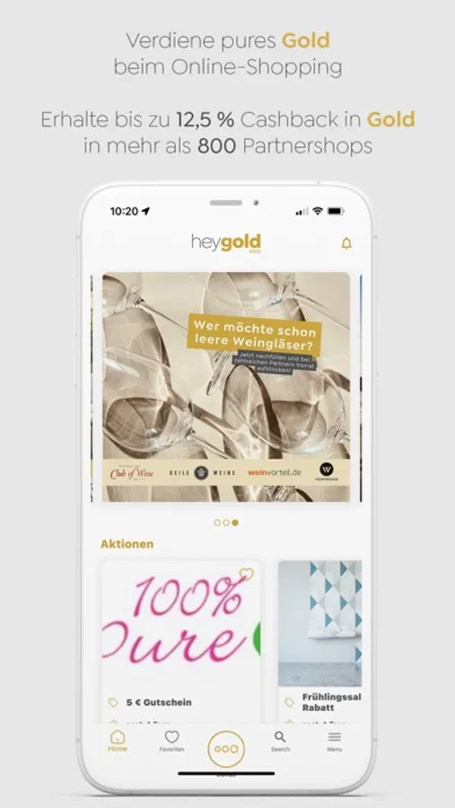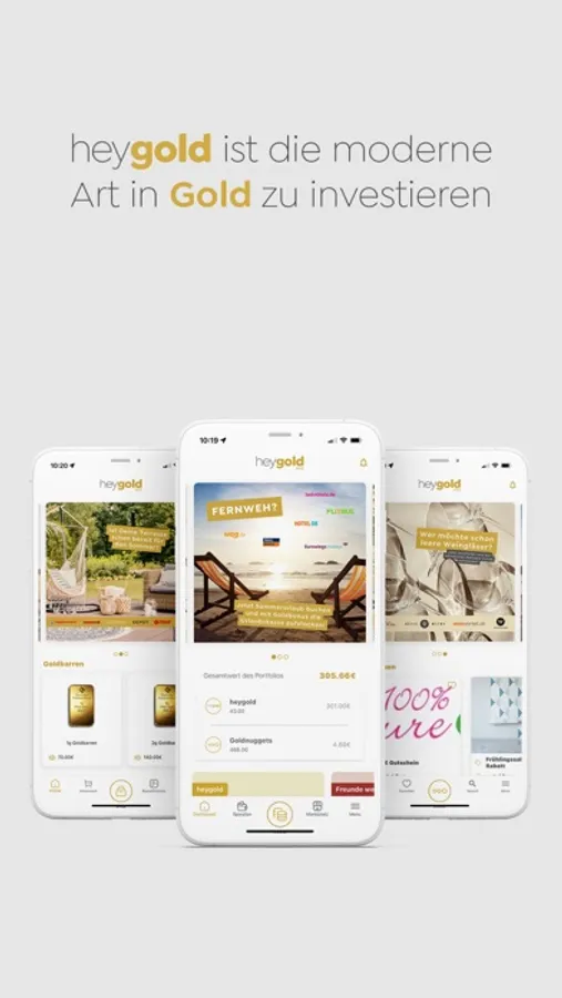 Discover the heygold world and invest in gold directly via the heygold app. With our bonus system you can also collect pure gold while shopping in more than 900 partner stores. You want to buy physical gold? No problem, in the heygold mall you will also find a wide range of gold bars and exclusive gifts. The heygold Club, on the other hand, helps you to find your way in the world of finance and provides you with interesting facts about gold and finance.