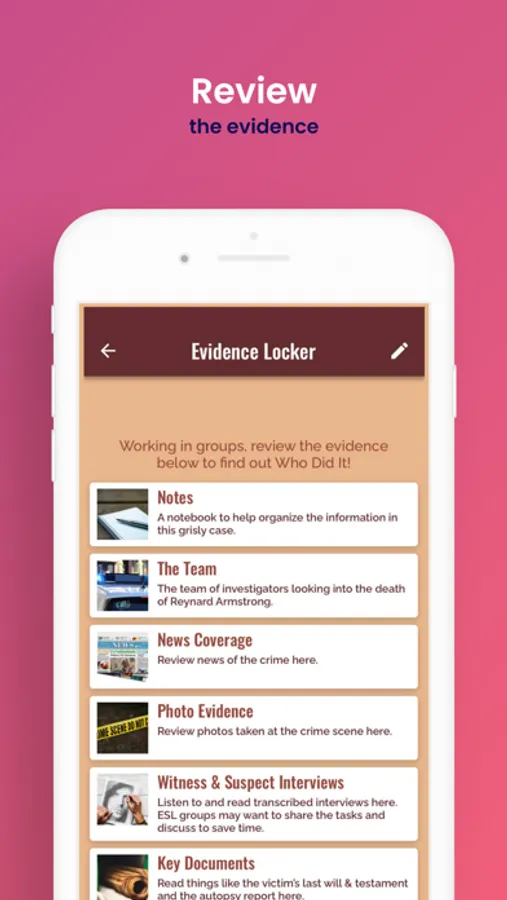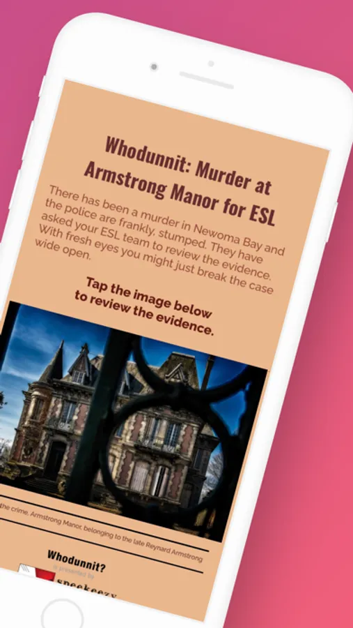 Get your students into groups to solve the mystery of Murder at Armstrong Manor. This Whodunnit has all the advantages of project-based learning PBL, fostering problem solving, critical thinking, collaboration, enhanced communication skills while engaging the kinds of learners that are often left behind in the traditional classroom. Through a PBL approach, students are empowered to find their own paths through the chaos of evidence using English to explore, assess and ultimately arrive at a synthesis.