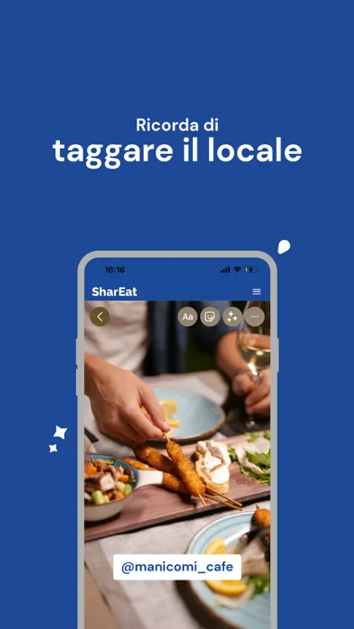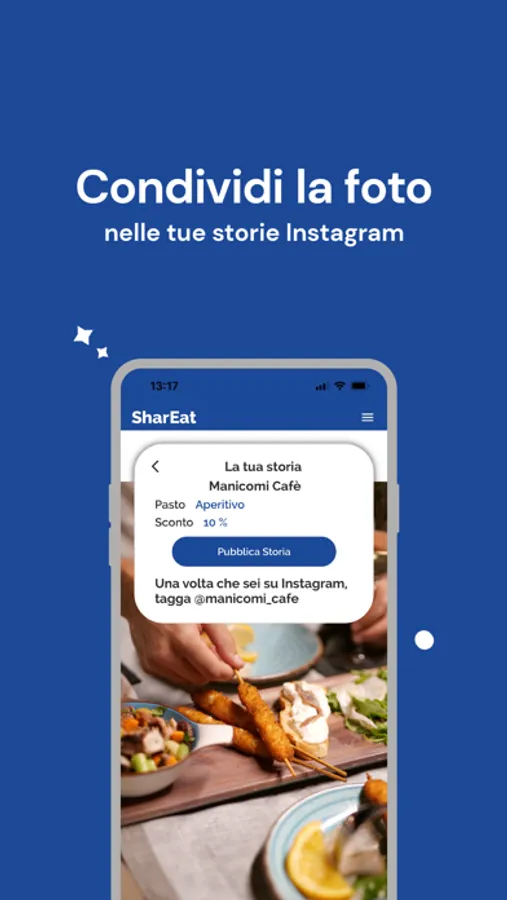 Condividi la foto sulle Instagram Stories tramite SharEat e tagga la pagina del locale, otterrai una ricompensa immediata al momento del pagamento!