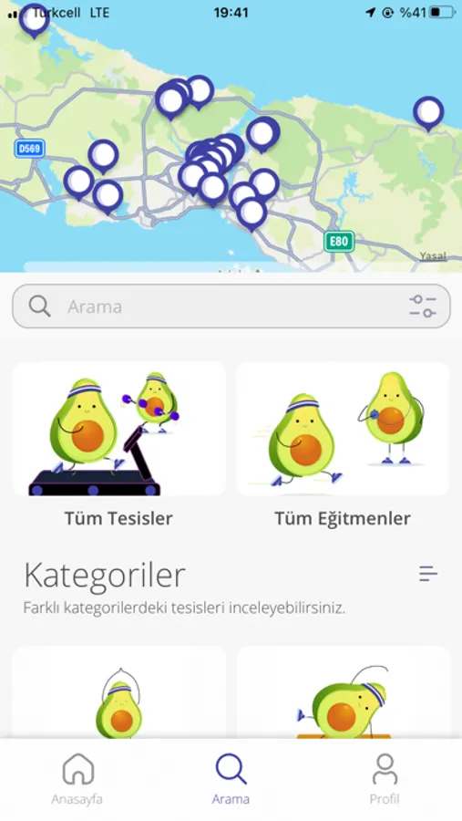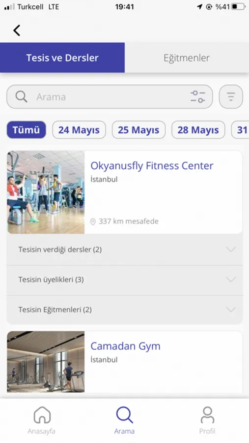 - Keşfet: Civardaki tüm spor tesislerini ve özel spor eğitmenlerini bul.