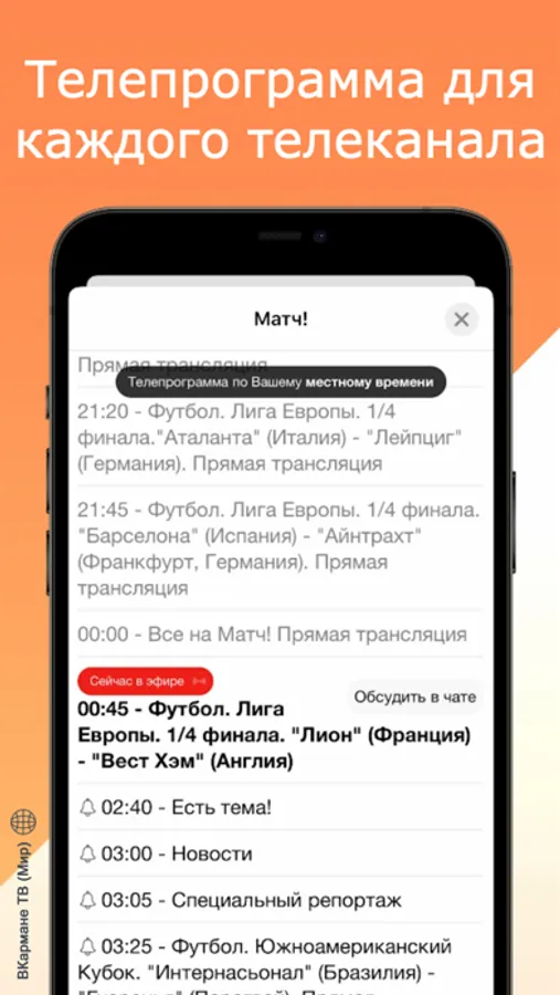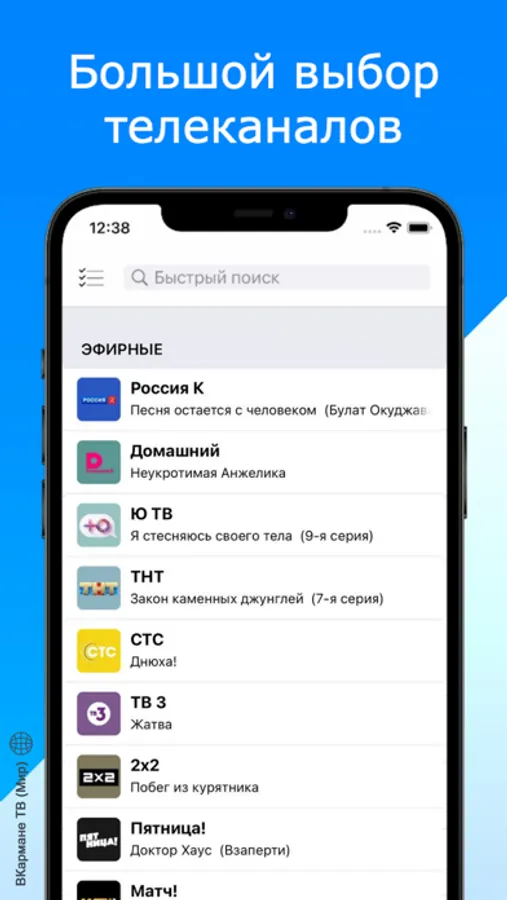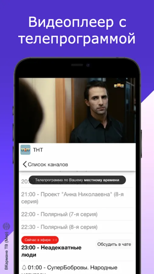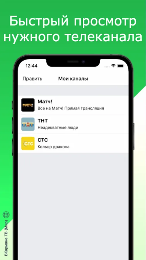 С «ВКармане ТВ (Мир)» Вы всегда сможете смотреть цифровое российское (а также СНГ) телевидение везде, где захотите. Вы не пропустите любимую ТВ-передачу или красивый и важный момент в футбольном матче, ведь для большинства каналов предусмотрен архив, а также пауза или перемотка прямого эфира до 10 часов назад (timeshift). Также можно послушать радио. «ВКармане ТВ (Мир)» не позволит Вам заскучать!