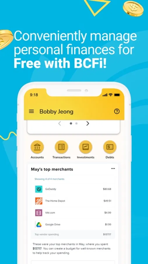 The BCFi app provides a comprehensive and easy-to-digest picture of your personal and business finances. In connecting to all relevant financial institutions, BCFi is able to aggregate all of your financial information in order to offer key insights in such areas as Spending, Investments, Transactions, Debts, Cash Flow, and Net Worth. BCFi also highlights financial Goals, tracks Budgets, and identifies key Trends.