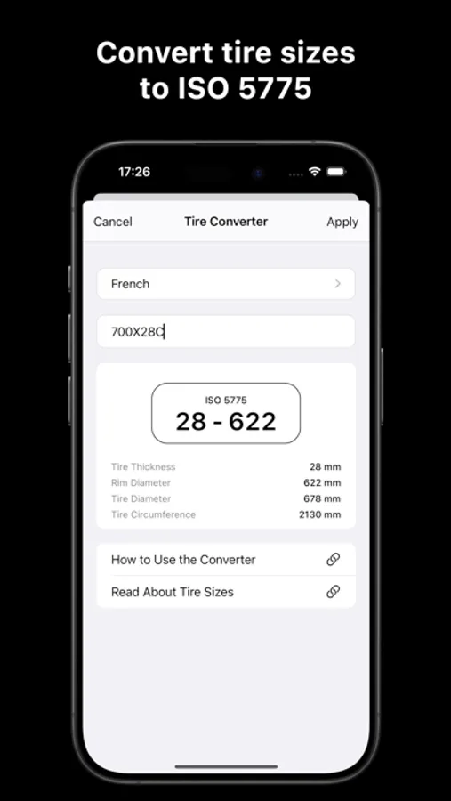 BikeCalc follows the ISO 5775 specifications and provides a convenient table to convert older tyre sizes.