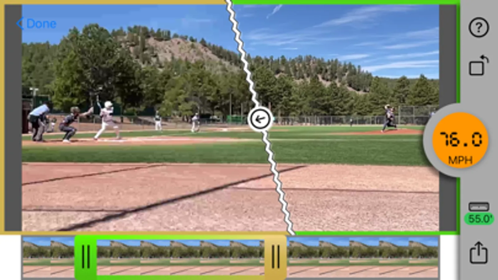 Pitch Speed allows you to take a video of a pitch, including the pitcher and catcher, and then measure the speed of a pitch by selecting the video frame when the pitcher releases the ball and selecting the video frame when the ball crosses the back of the plate. Distance can be adjusted for different distances, including pro/college, high school, youth baseball or softball. This app doesn't automatically measure the speed, but provides the tools to easily calculate the speed.