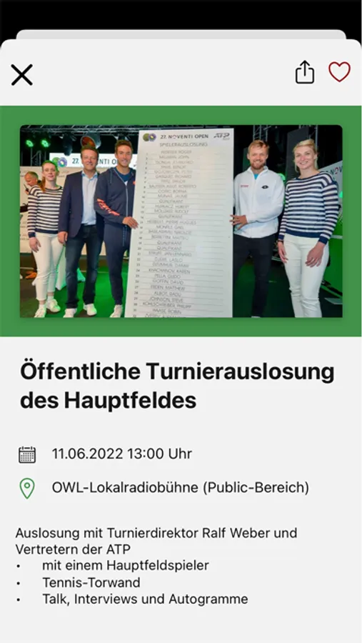 If you are there live on site at the OWL ARENA, the app will help you to get the maximum experience out of your tournament day. Receive a push message when the stars of the ATP give autograph sessions, special events take place on the arena grounds or the best bands live on stage provide unforgettable highlights next to the court.