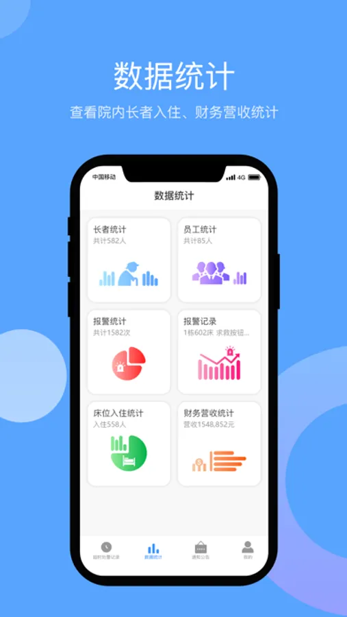 支持查看院内长者统计、员工统计、报警统计、床位入住统计、院内营收统计等。