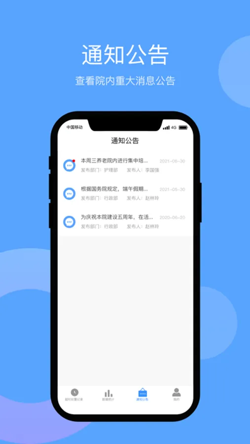 支持查看院内通知,包含培训、奖惩、活动、放假通知等。