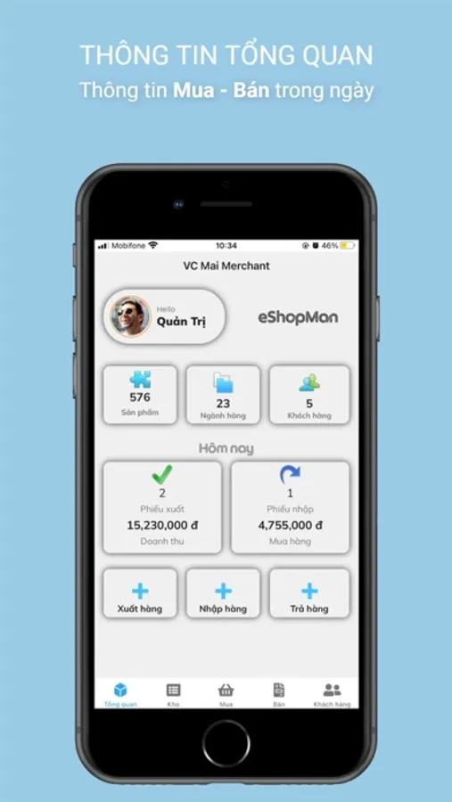 Ứng dụng eShopMan trên thiết bị di động giúp bạn bán hàng nhanh chóng, tiện lợi, mọi lúc mọi nơi. Tiết kiệm chi phí đầu tư thiết bị/máy tính.
