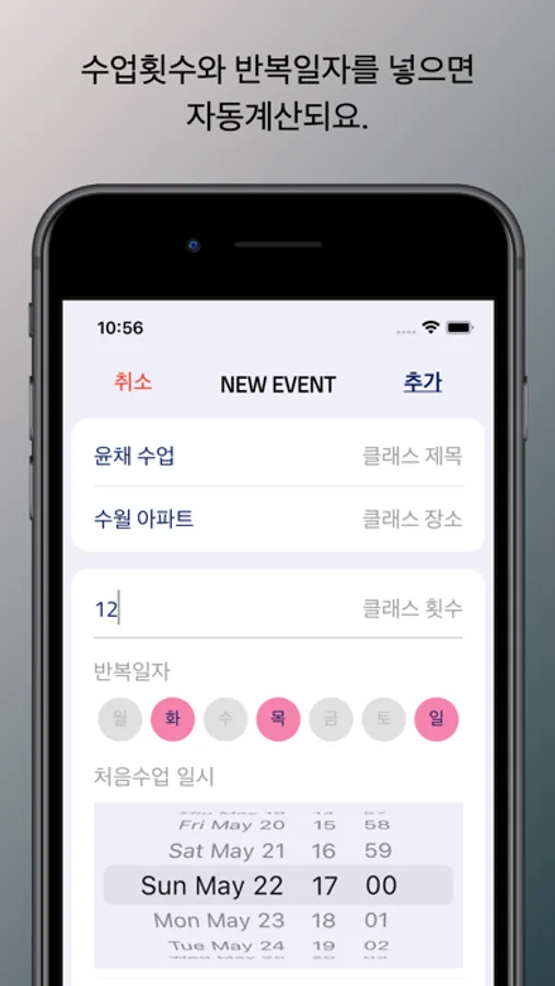 유저가 등록하고자 하는 수업의 반복적인 요일과 전체 수업 횟수를 선택하면,