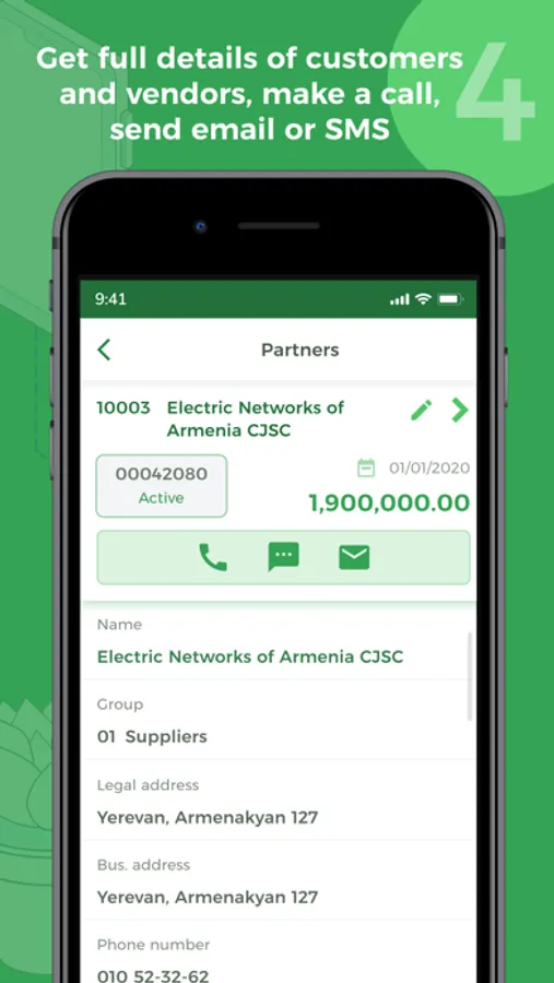 • Get full details of customers and vendors, make a call, send email or SMS