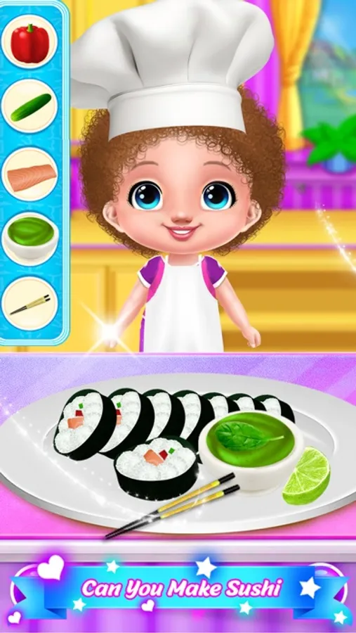 Create amazing dishes on this amazing new game! All kids compete on fun game that you can make lots od dishes like: Sushi, Pizza, hamburguer , Pasta en much much more.