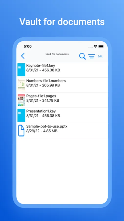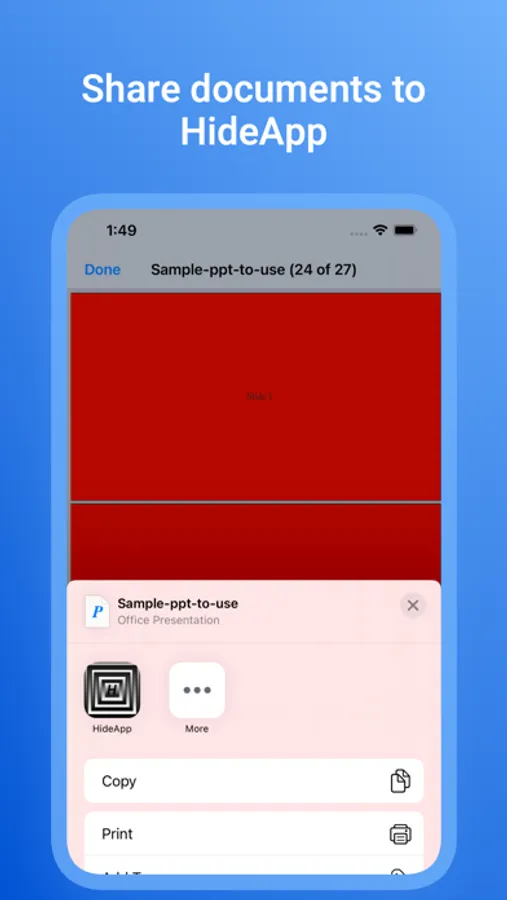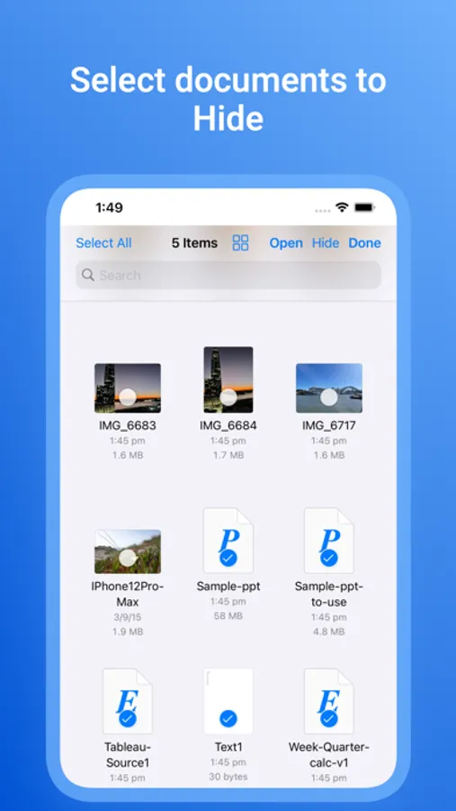 • Hide/encrypt any document (PDF, MSWord, MSExcel, MSPowerPoint, Pages, Keynote, Numbers, Text files and many more)
