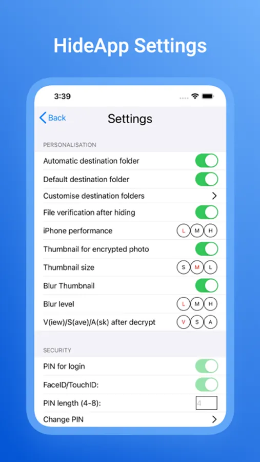 • Login using 4-8 digit PIN or Biometric (TouchID or FaceID)