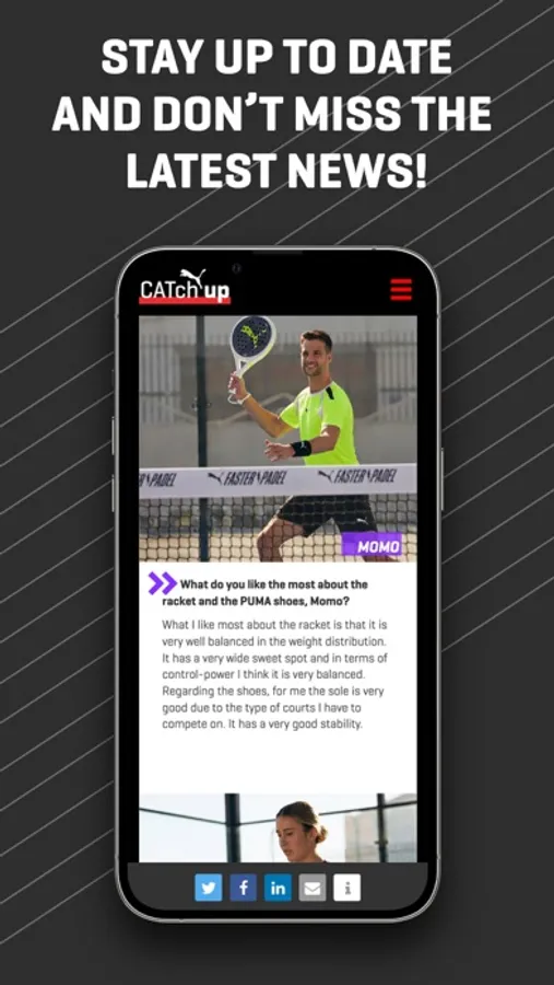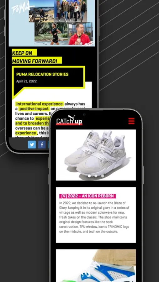 If you are a part of the PUMA Family and want to stay up to date with the fastest sports brand in the world, the CATch up app is for you. Exciting stories about sports, fashion, sustainability, history, business and our employees are waiting here!